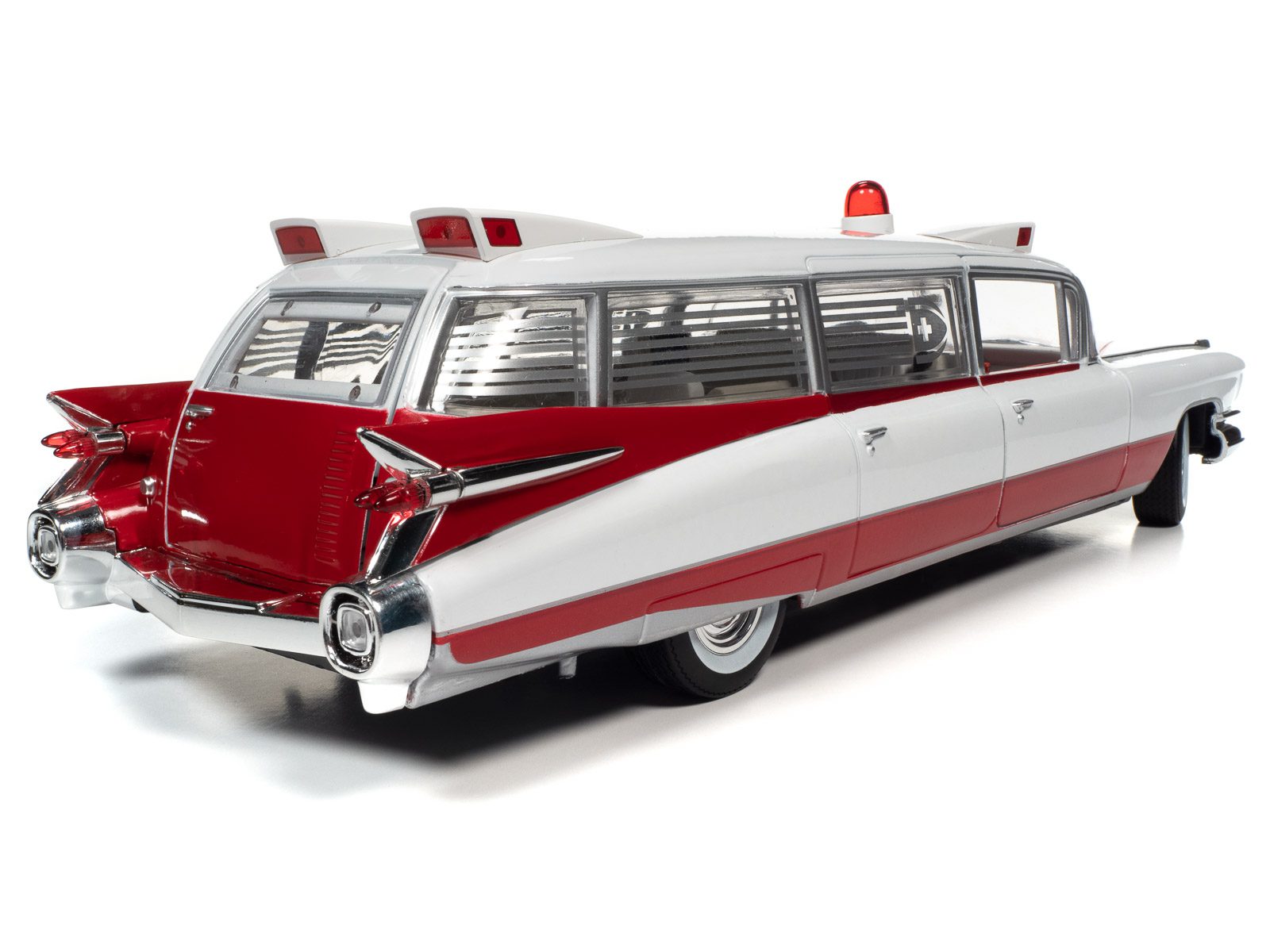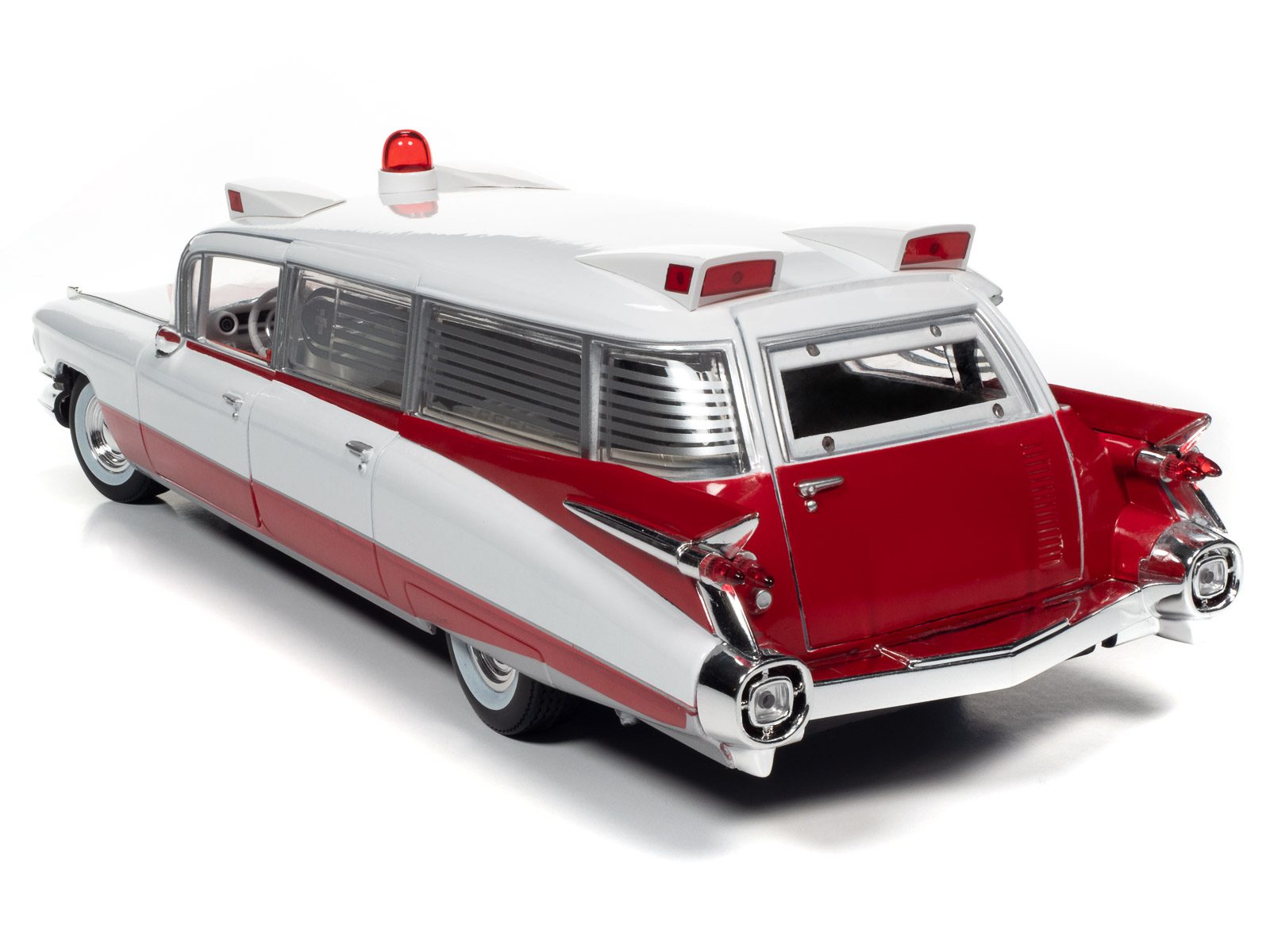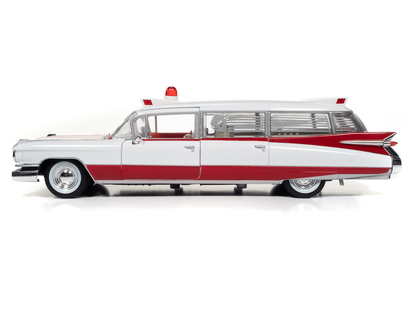 Auto World has replicated this 1959 Cadillac Ambulance in a 1:18 scale! This die-cast shares the iconic tailfins from the 1959 Cadillac Eldorado. Mounted to the roof is a NEWLY TOOLED bubble light flanked by red-lensed emergency flasher housings on all four corners. Featuring period-correct red and white two-tone paint, this iconic 50s ambulance is ready to resuscitate your die-cast collection!
