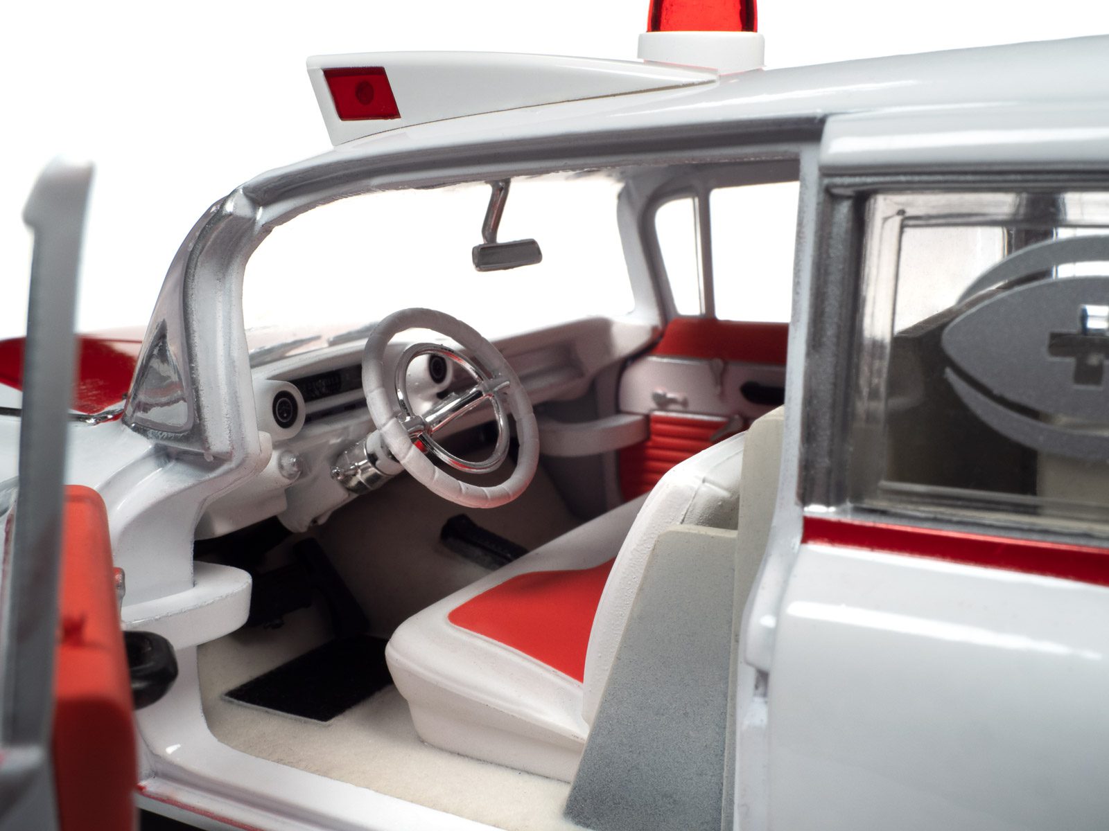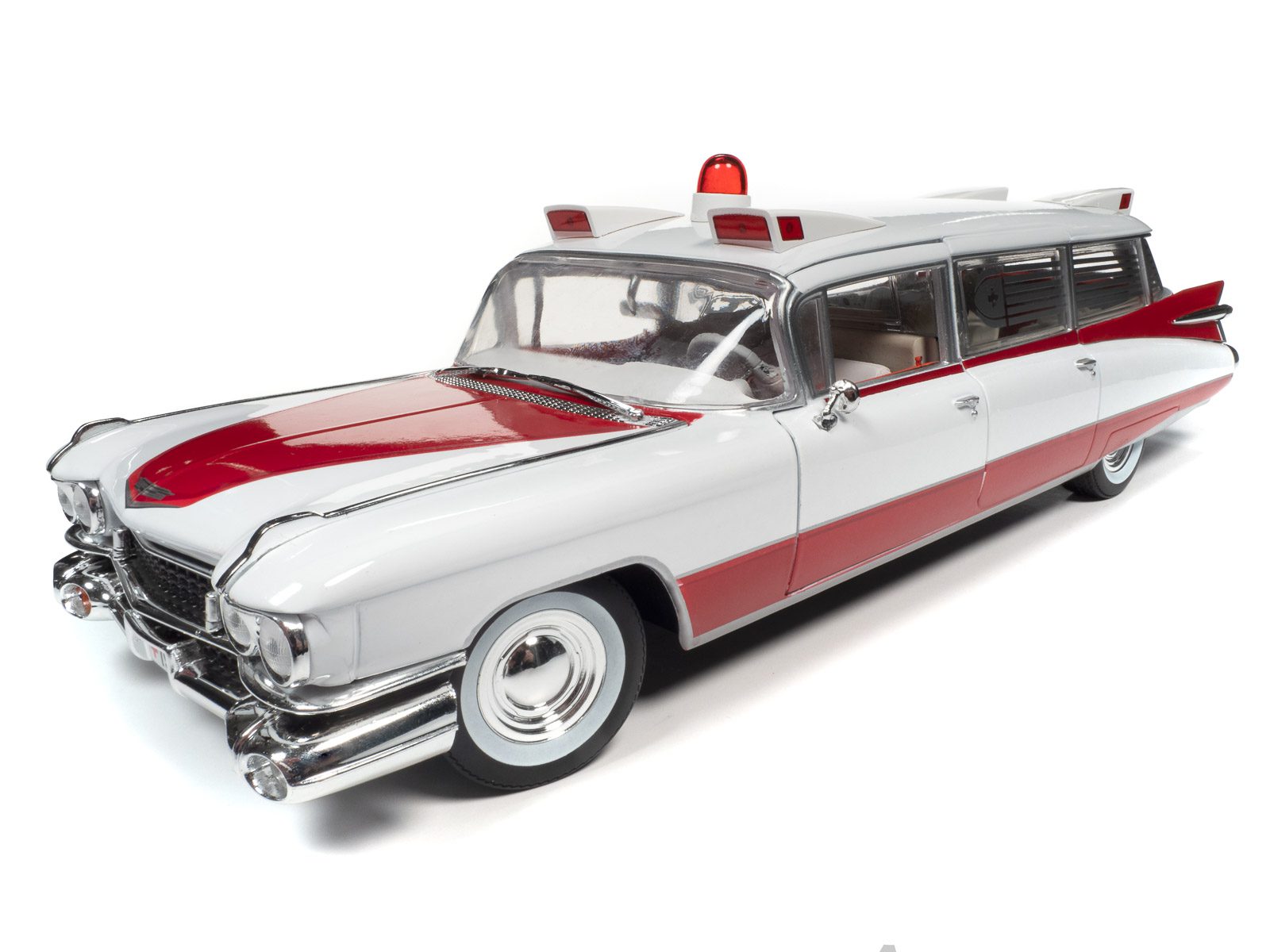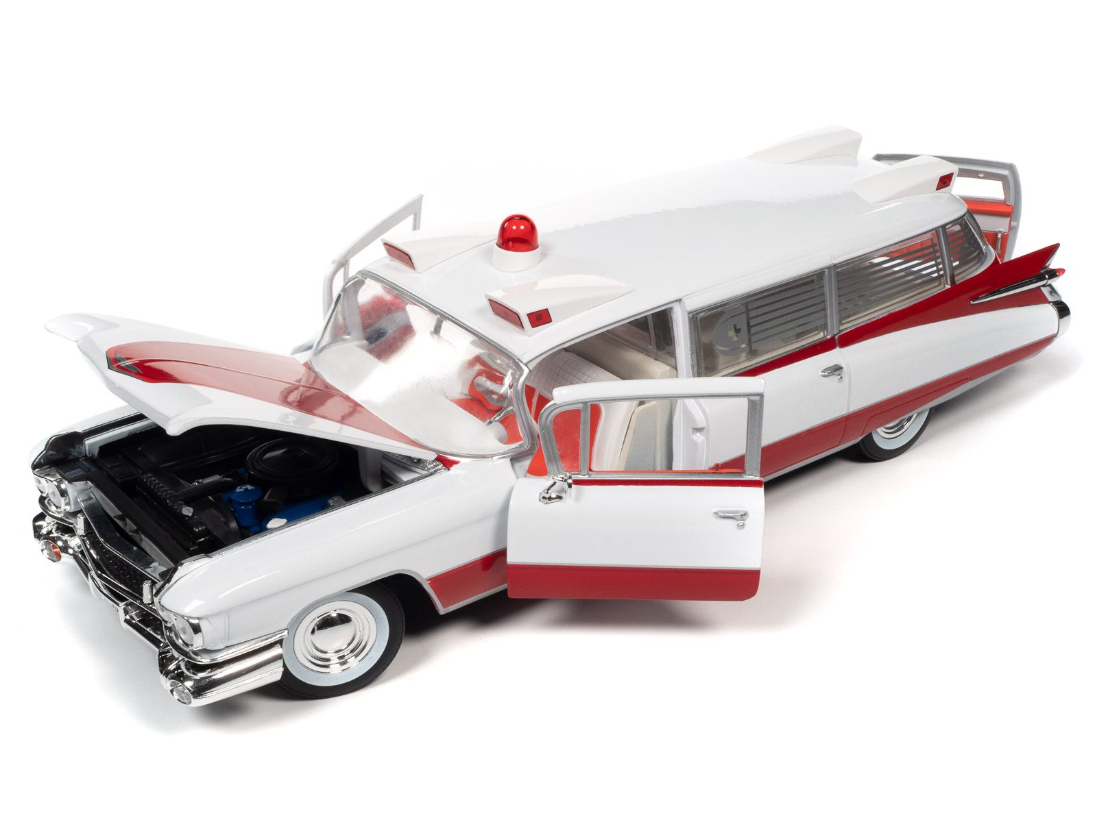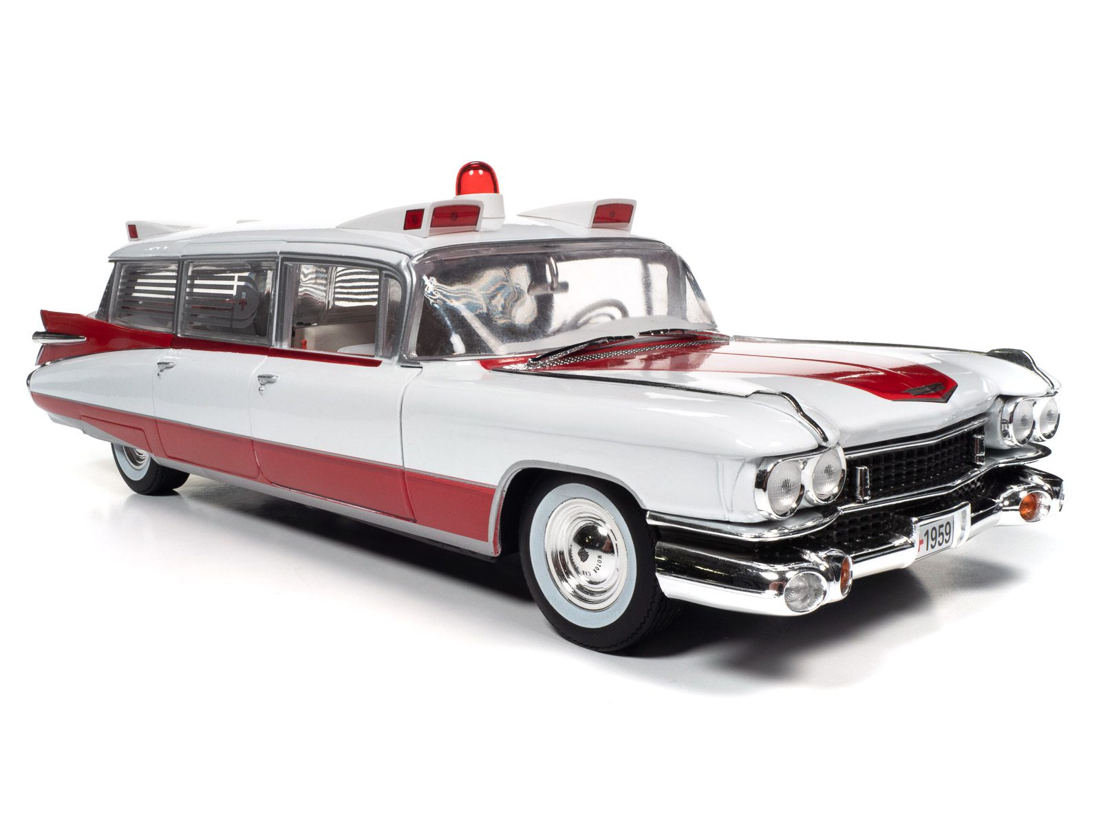 Auto World has replicated this 1959 Cadillac Ambulance in a 1:18 scale! This die-cast shares the iconic tailfins from the 1959 Cadillac Eldorado. Mounted to the roof is a NEWLY TOOLED bubble light flanked by red-lensed emergency flasher housings on all four corners. Featuring period-correct red and white two-tone paint, this iconic 50s ambulance is ready to resuscitate your die-cast collection!